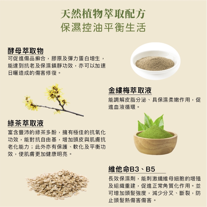 採用活酵母萃取液、水解小麥蛋白、咖啡因 3 大主要成分,延緩頭皮老化。保溼成分深入髮芯,有效減少因頭皮乾燥而造成的搔癢與白屑、加強脆弱髮絲的穩固力並滋潤秀髮。