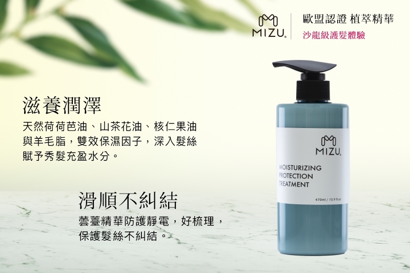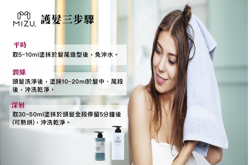 - 深層護髮 30~50cc,塗抹頭髮停留 5 分鐘(可加熱),沖水洗淨。